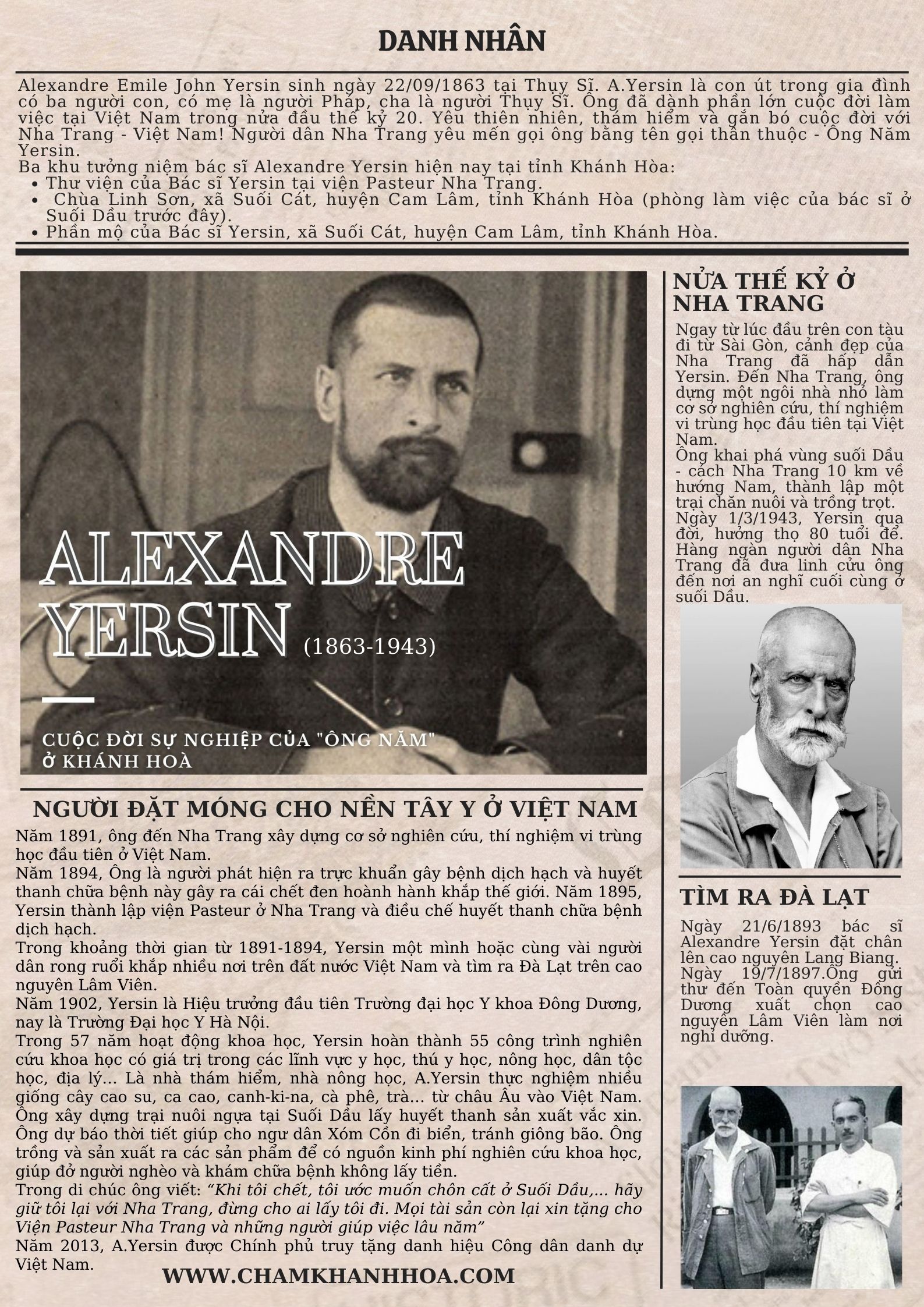 Nhắc đến Khánh Hoà mà không nhắc đến Yersin thì chắc chắn phải là một thiếu sót lớn. Yersin – Người dành tình yêu với mảnh đất Khánh Hoà nói riêng và Việt Nam nói chung đã để lại nhiều di sản lớn đến tận ngày nay. Hiện nay, nhiều thành phố đã lấy tên ông đặt tên đường như: Hà Nội, Nha Trang, Đà Lạt, thành phố Hồ Chí Minh… Đó là những nơi thường gắn liền với các hoạt động của ông.