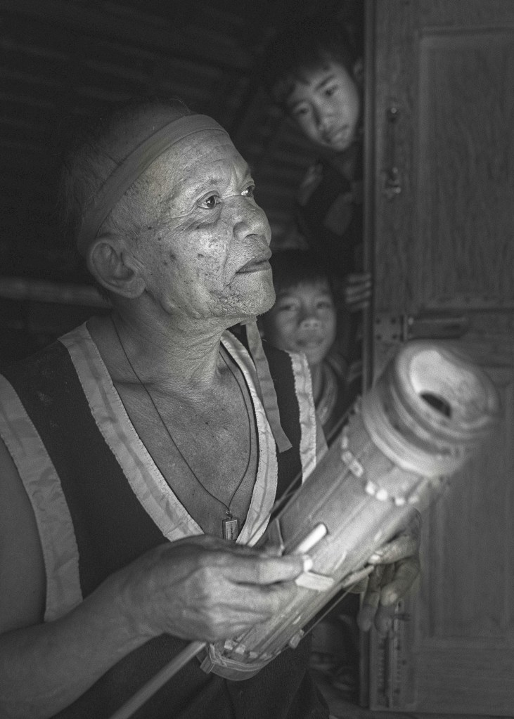 Chơi đàn Chapi – Một trong số những nhạc cụ truyền thống bằng tre của người Rắc-lây. Dây đàn cũng là sợi tre nhé! Ảnh: Trần Hải Bình