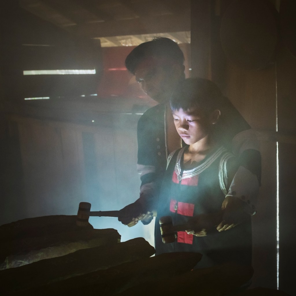 Hướng dẫn trẻ con chơi đàn đá. Người Rắc- lây ngày càng chú trọng đến việc bảo tồn những nét văn hóa truyền thống của dân tộc mình. Một trong số đó là cách chơi những nhạc cụ quan trọng đối với đời sống dân tộc như đàn đá, mã la và chapi. Ảnh: Diệp Vy Hòa