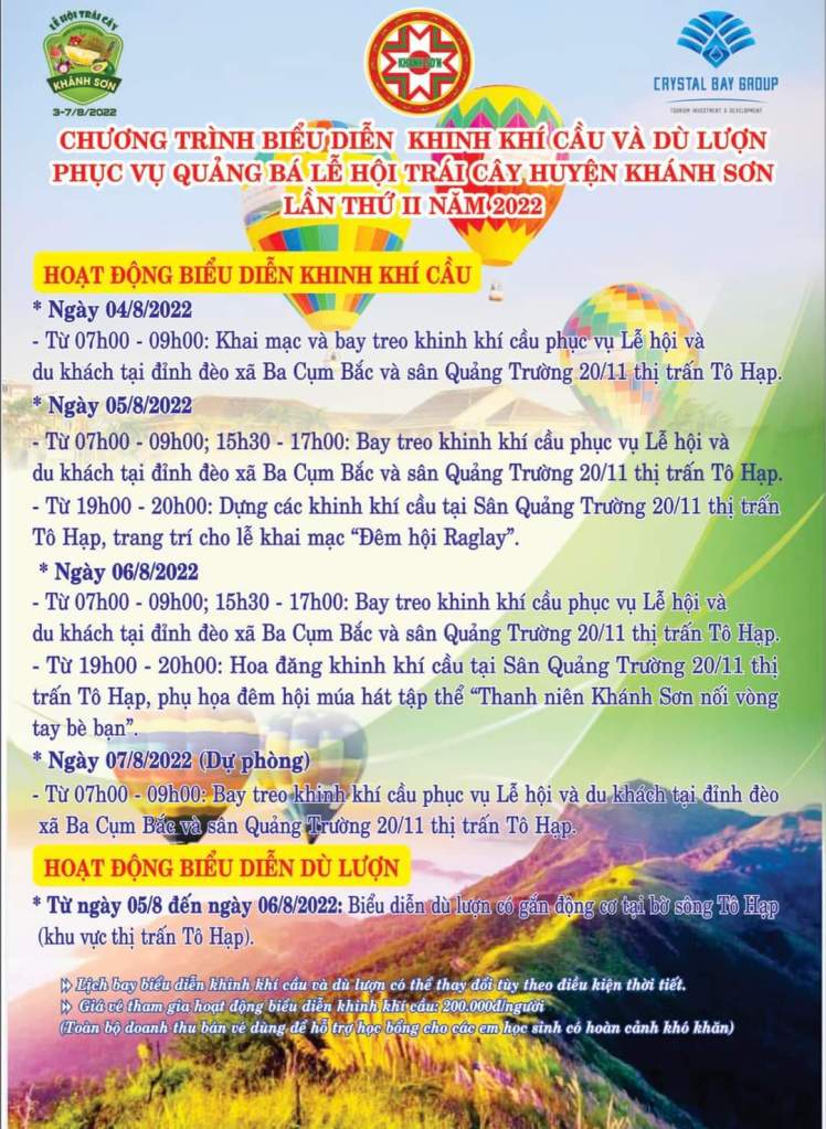 UBND tỉnh Khánh Hòa vừa cho phép tổ chức bay treo khinh khí cầu tại đỉnh đèo Khánh Sơn và thị trấn Tô Hạp phục vụ Lễ hội trái cây huyện Khánh Sơn. Theo đó thời gian tổ chức là từ ngày 3-8 đến ngày 7-8, Công ty TNHH Du lịch Sao Sài Gòn chịu trách nhiệm tổ chức sự kiện trên. Ban tổ chức sẽ cho bay treo cố định 2 khinh khí cầu cấp 7 ở độ cao tối đa 50m tại đỉnh đèo Khánh Sơn và thị trấn Tô Hạp để người dân chụp ảnh, đồng thời làm tăng hiệu ứng sự kiện Lễ hội trái cây huyện Khánh Sơn.