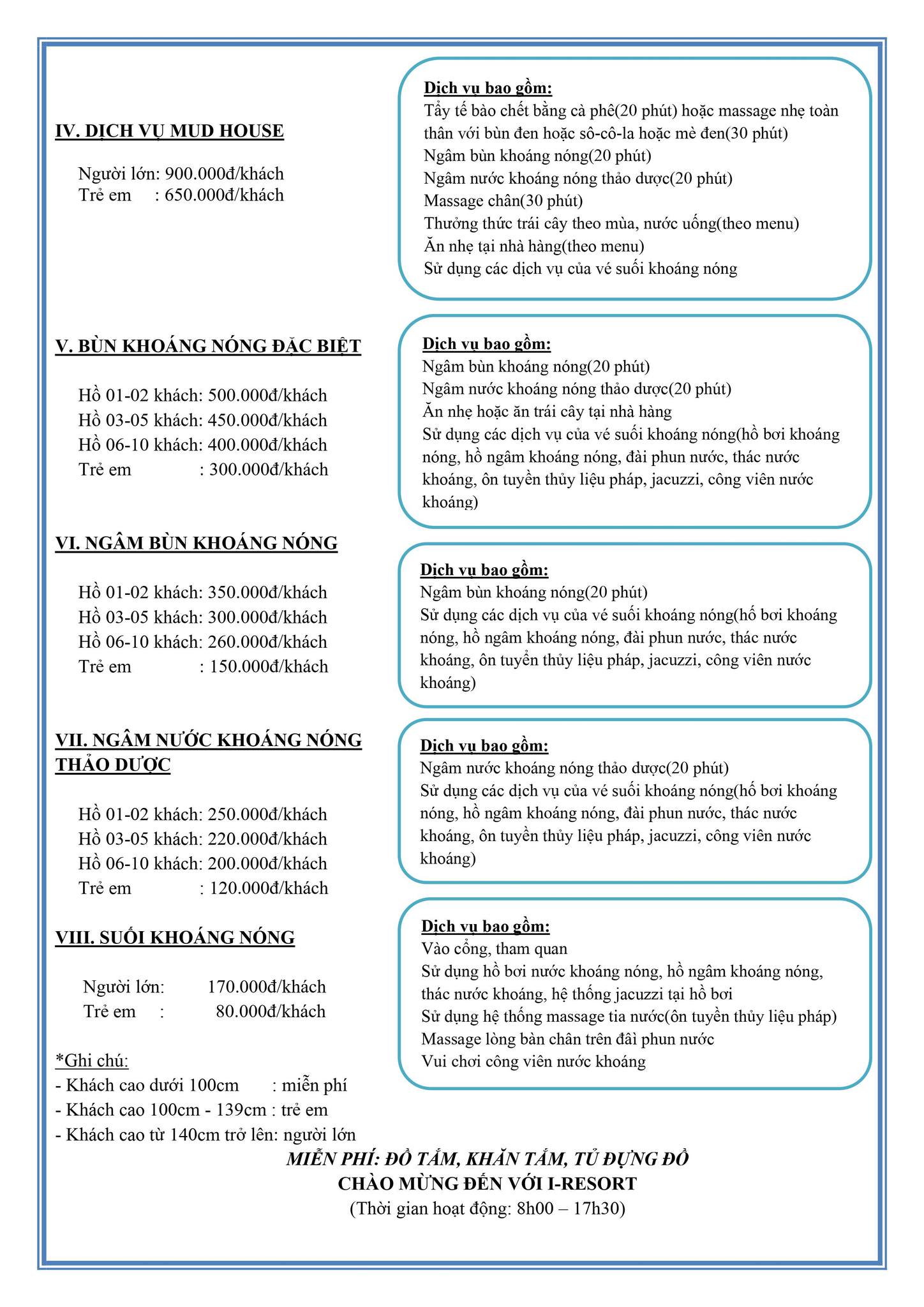 Du khách đã có thể thư giãn ngâm mình trong hồ bùn khoáng thiên nhiên chất lượng với mức giá vé dao động từ 200.000 đến 350.000 đồng. Hoặc tùy vào sở thích và tài chính, du khách có thể chọn lựa các gói dịch vụ kết hợp với massage chân, spa V.I.P, nghỉ dưỡng bungalow,… với mức giá từ 1.800.000 đồng.