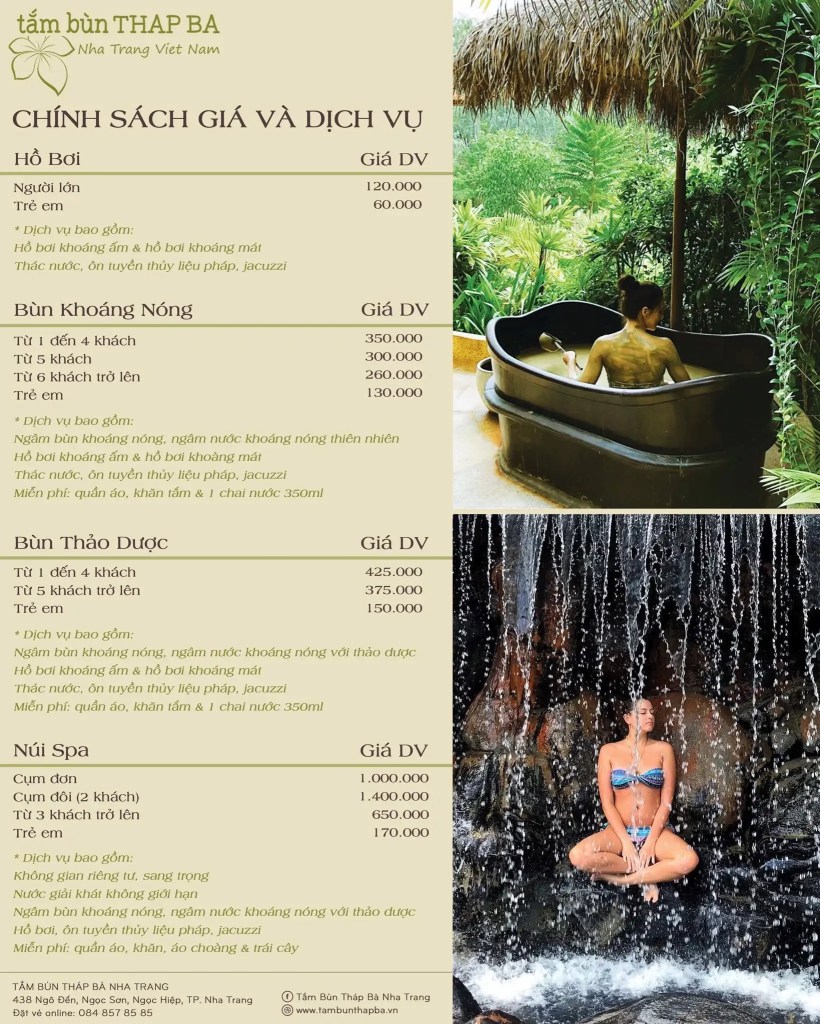 Vị trí gần Tháp bà Ponagar giá khá rẻ so với các địa điểm còn lại. Lưu ý: được mang theo đồ ăn, thực phẩm đã nấu chín, trái cây và được phép sử dụng tại các chòi nghỉ ngơi ở khu vực hồ bơi. Tuyệt đối không được mang theo bếp ga, các chất gây cháy nổ vào khuôn viên của Tắm Bùn Tháp Bà.