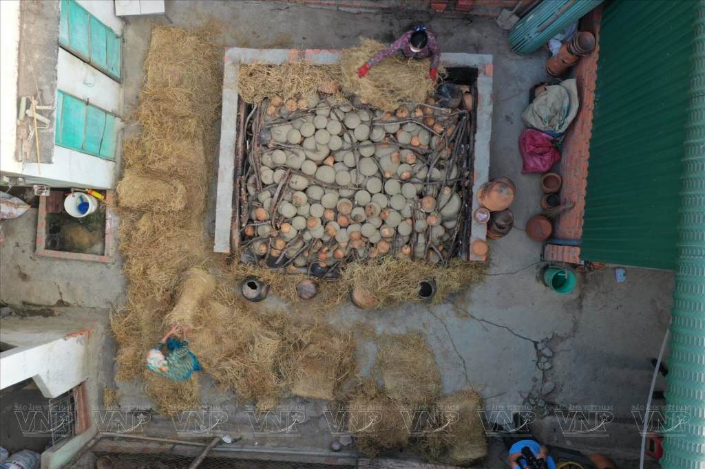 Gốm được phơi nắng rồi nung lộ thiên bằng củi hoặc rơm. Lửa và gió tạo nên những vệt loang màu vàng đỏ, hồng, đen xám… không chiếc nào giống chiếc nào. Mỗi sản phẩm là một bản thể riêng biệt, mang dấu ấn của người thợ và của đất trời.