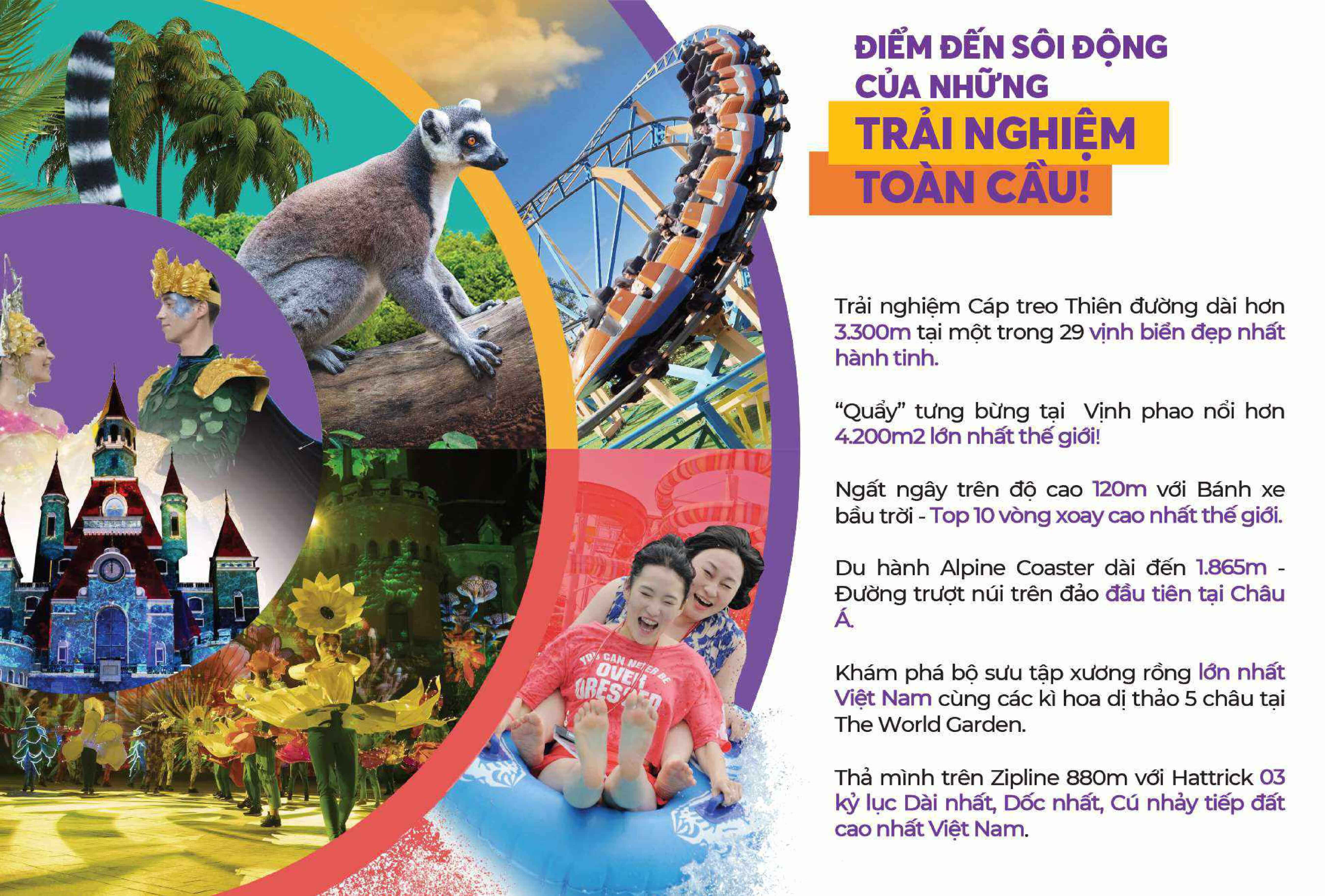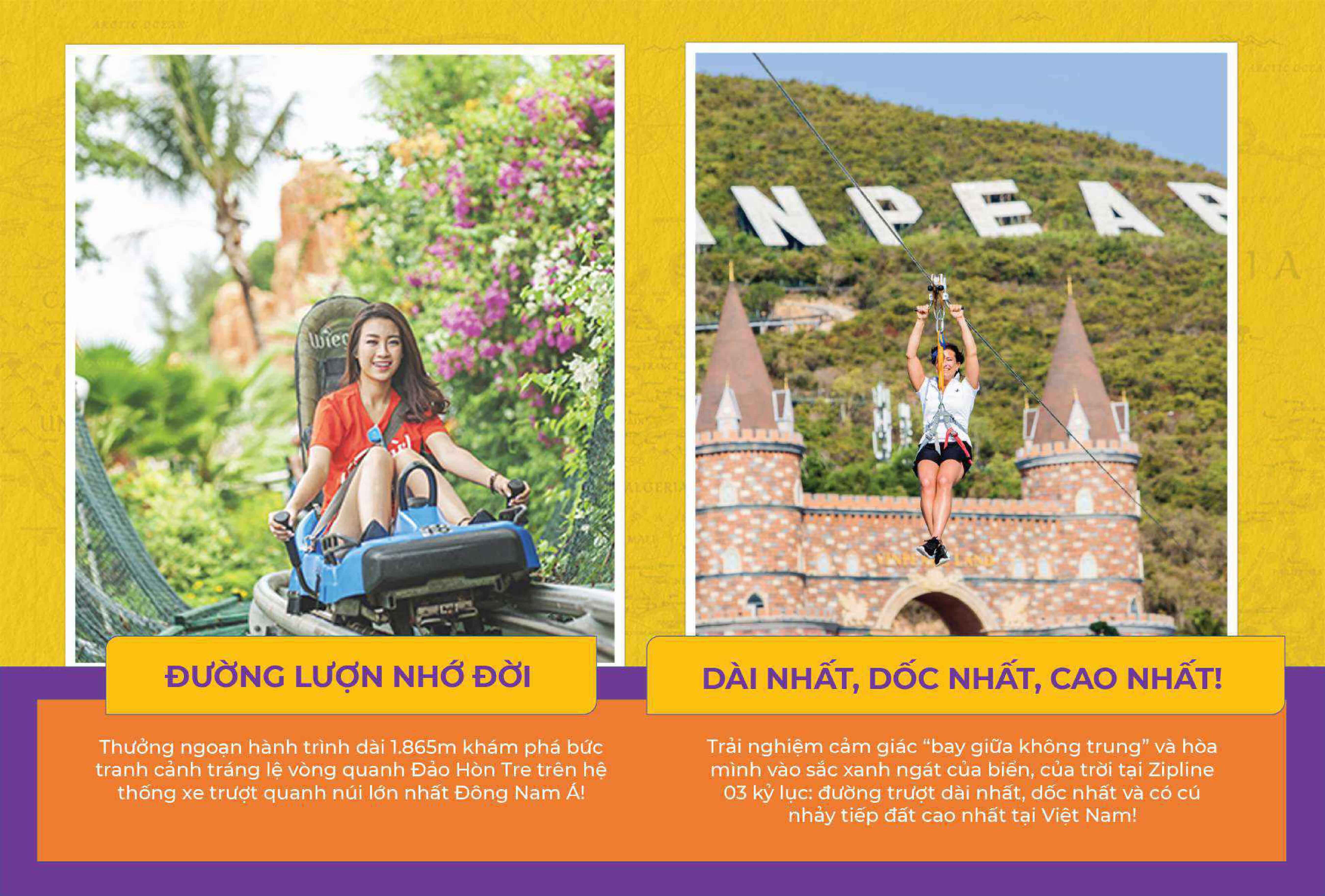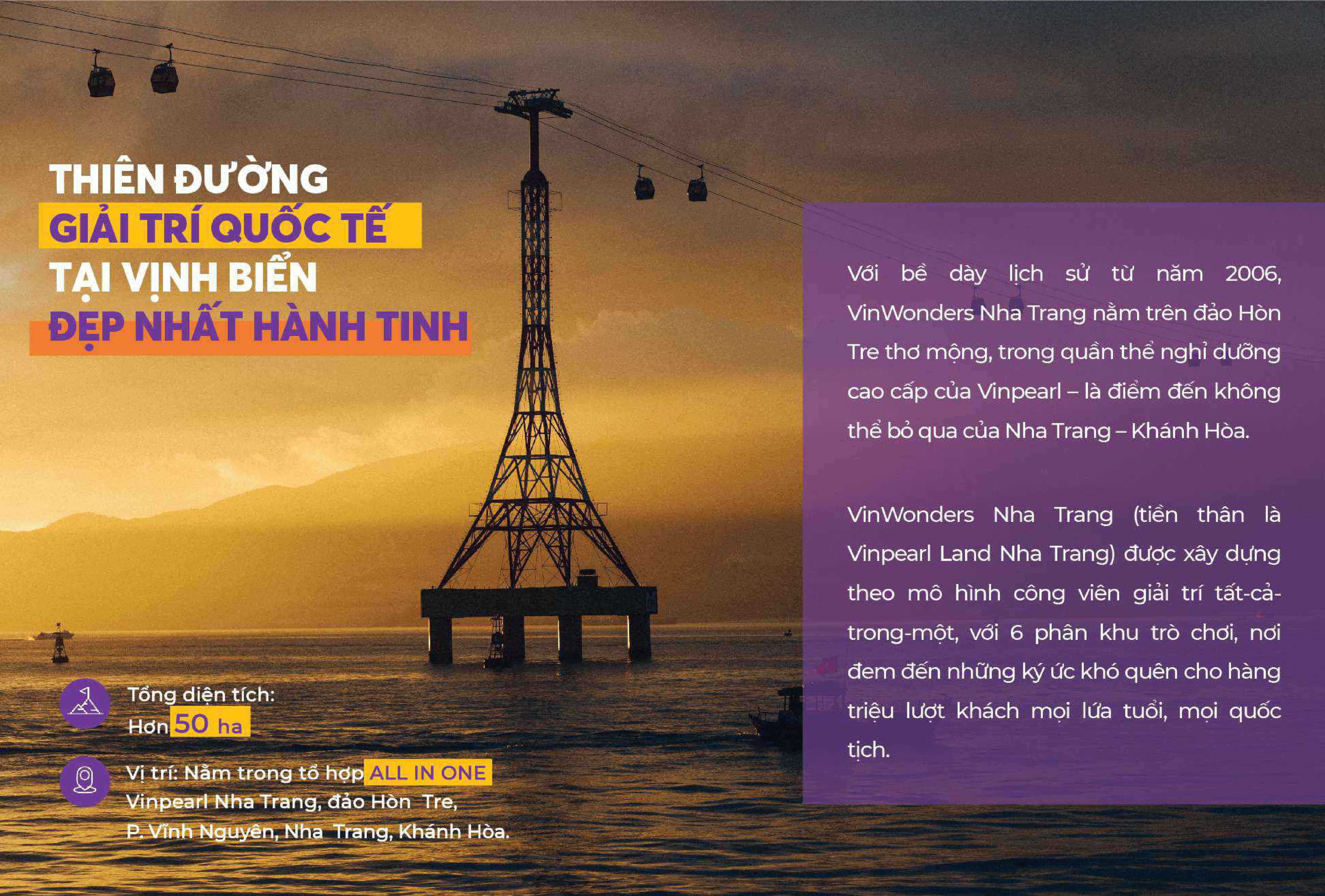 VinWonders Nha Trang được xây dựng với mô hình công viên giải trí “tất cả trong một”. Sáu phân khu trò chơi nơi đây tự hào nắm giữ nhiều kỉ lục Việt Nam và Thế giới, là lựa chọn hàng đầu của những du khách sành điệu, đón đầu xu hướng và đam mê các trải nghiệm đẳng cấp thế giới tại thành phố biển Nha Trang.