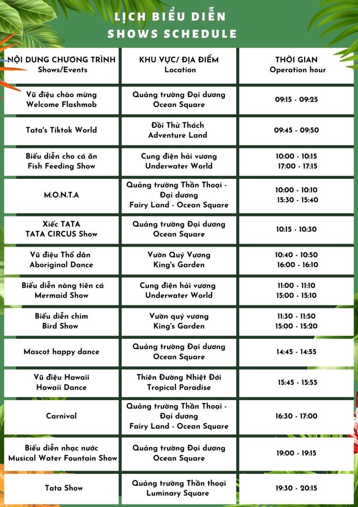 Để chủ động thời gian vui chơi trải nghiệm nhiều nhất có thể tại VinWonder bạn có thể tham khảo bài viết Chia sẻ kinh nghiệm đi chơi VinWonders Nha Trang tại đây và xem thêm lịch trình các show biểu diễn có tại VinWonders Nha Trang phía bên dưới: