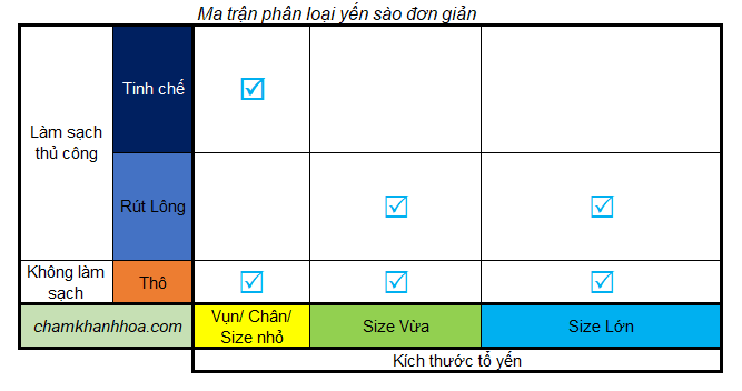 Hôm nay, NhaNest – Yến sào Nha Trang Khánh Hòa xin dùng một ma trận đơn giản để giúp mọi người dễ dàng hơn trong việc xác định cách để phân loại yến sào. Tuy nhiên, bài viết này xin chỉ giới hạn trong phân loại tổ yến trắng vì mức độ phổ biến của nó. Còn lại các yến huyết, hồng yến sẽ không nằm trong bài viết này.